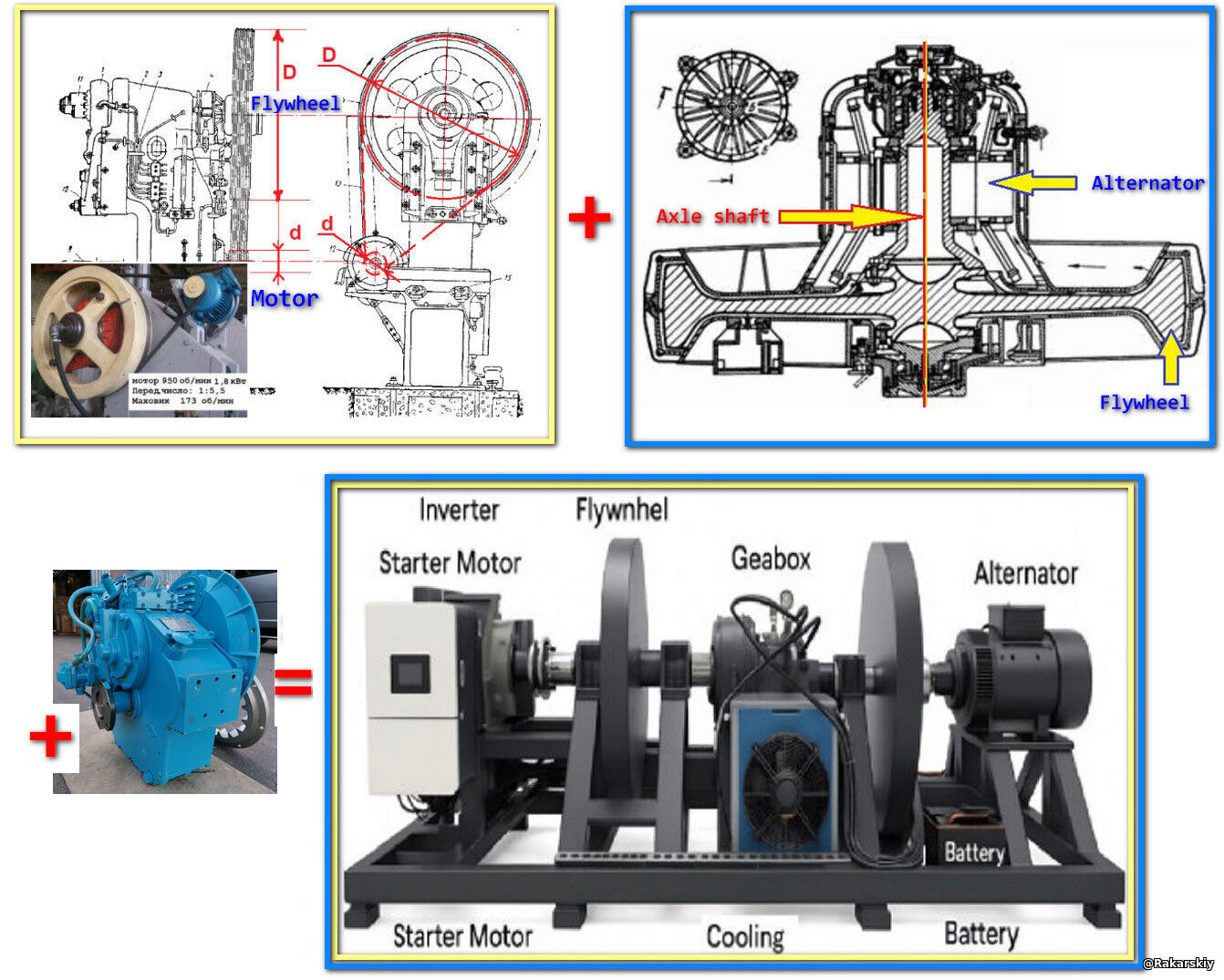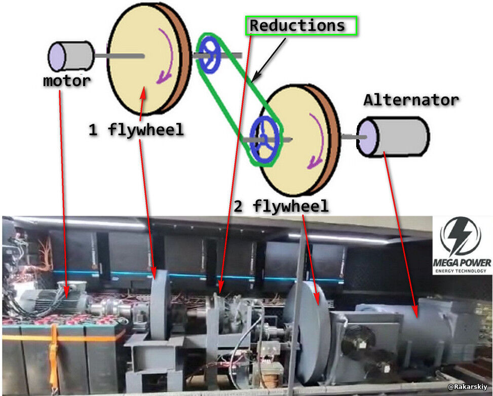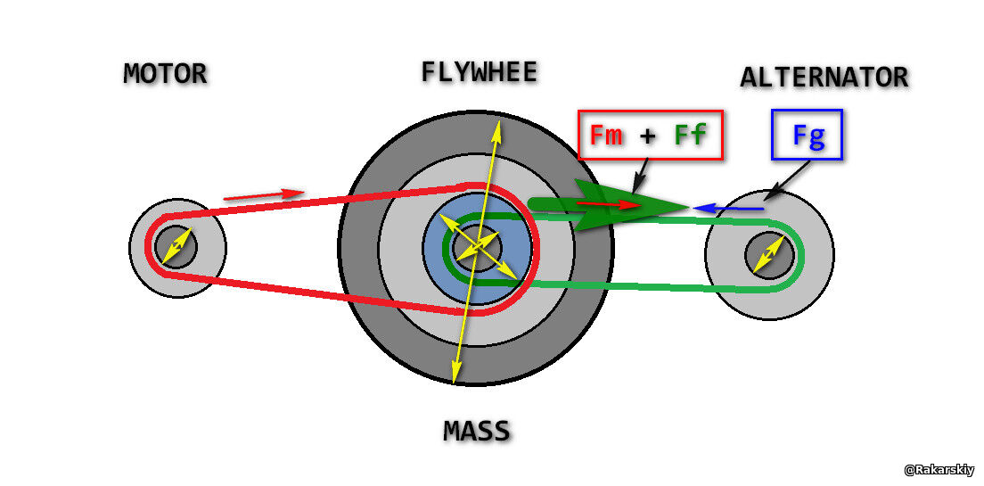 Для роботи системи електрогенерації з маховиком, треба збуджувати або провокувати кінетичний імпульс. Маховик буде віддавати свій крутний момент навантаженню до вирівнювання сил дії (динамічного моменту маховика + статичного момету двигуна) та протидії (електромагнітного [статичного] моменту електрогенератора під навантаженням). Як що розігнати систему на постійний режим то балансування швидкості обертання, кожного елемента, система почне само балансуватися, а це призведе до зупинці Якщо в нас будуть два різних статичних кінетичних моменти протидіяти, то при рівних, умовно, швидкостях обертання після розгону, система знайде середню точку, а це гальмування та зупинка в подальшому. Тобто треба якась провокація кінетичного імпульсу для підтримування системи в обертанні мас маховиків на потриній швідкості обертання.