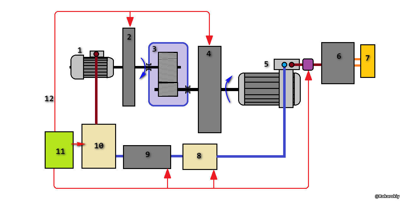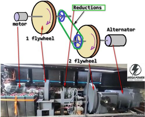 Важлива річ – це керування швидкістю першого маховика. У процесі роботи він прискорюється без контакту з другим маховиком та генератором. В даний час генератор та другий маховик працюють на ефекті електромеханічного UPS. Місткість кінетичної системи повинна забезпечити обертання 2 маховика і генератора на повній потужності при розгоні першого маховика в ємність, коли можна буде передати кінетичний імпульс для підштовхування другого маховика з генератором. Тому цей кінетичний гідромеханічний вузол ланцюга такий важливий. Там комутуються дуже великі механічні потужності порівняно з потужностями двигуна та генератора.