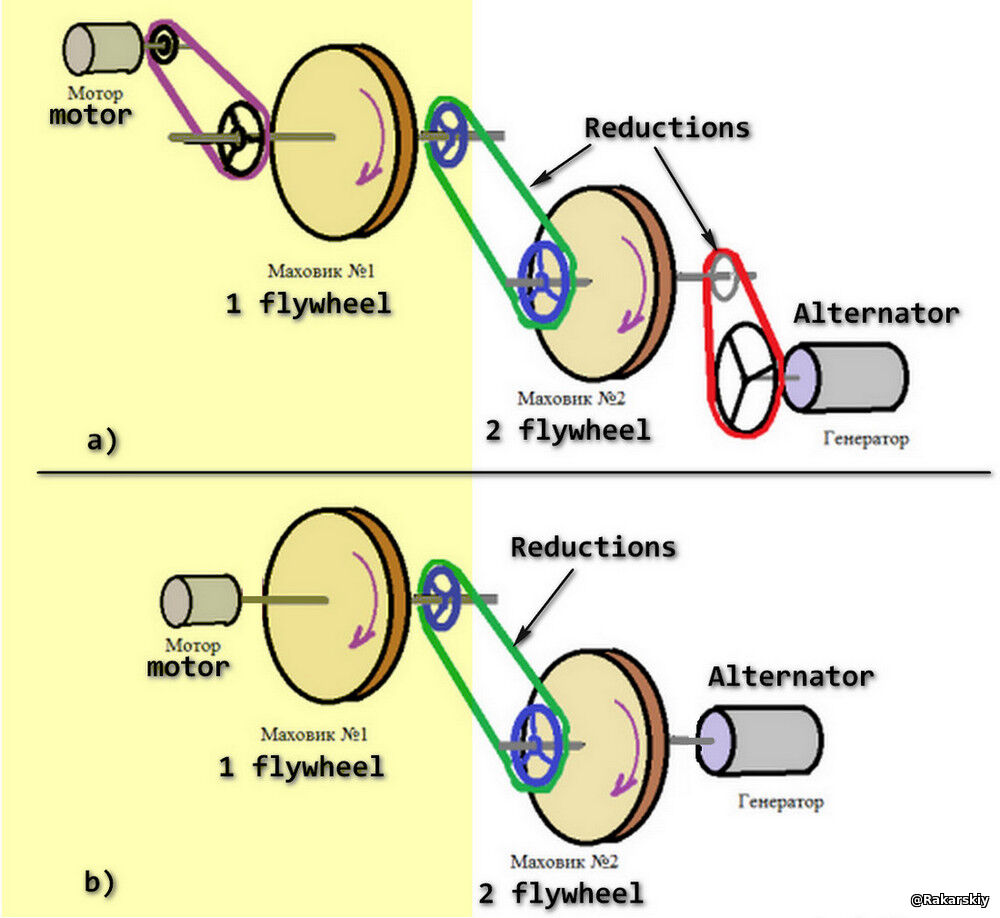 В своєму дослідженні я приводив приклад системи з двома маховиками. Де другий маховик стабілізаційний, на прикладі конденсаторів після діодного мосту. Перший маховик той шо створює достатній момент підштовхування обертання другого маховика. Але редукція зніження обертів на мій погляд повинна мати обгонну муфту або ріщення для зміни зчеплення кінетичного контакту (кліноременна передача зеленим коляром)