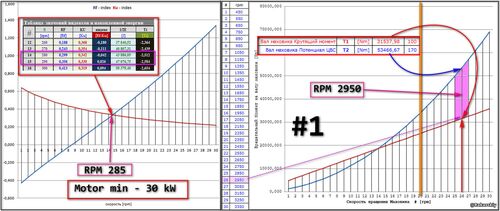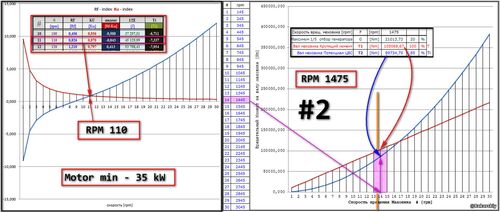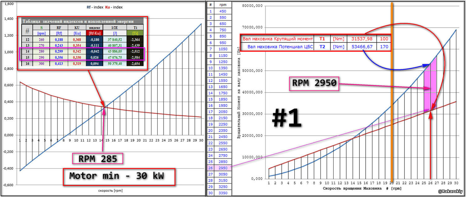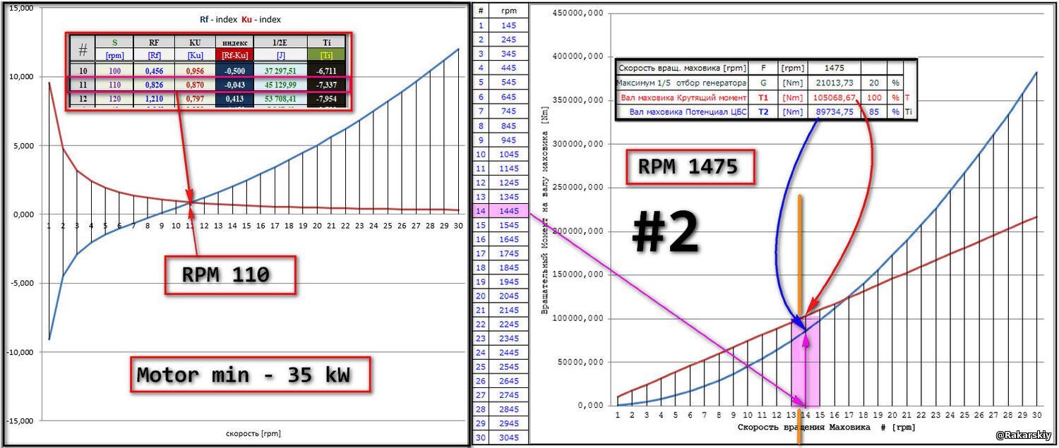 Якщо подивитися на графік, то нібито обрана швидкість (зеленим) не дотягує до точки перелому (червоним). Розроблений мною механізм розрахунку маховика і потужності його підкрутки показав інше значення, під час перетину двох графіків індексів [Rf = Ku], розрахована швидкість обертання склала 1965 об/хв. При цьому механізм розрахунку вельми точно вказував на необхідну мірність введення крутного моменту, для підтримки обертання маховика без повного навантаження мотора, практично на холостому режимі. На жаль, підійти до вибору крутного моменту для знімання мені не вдавалося. Одне було виразно точно, потрібно шукати.