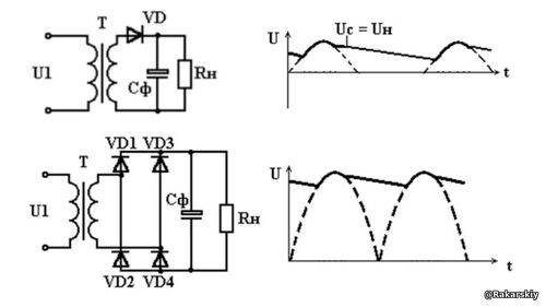 де: ΔU (Дельта U) — амплітуда пульсацій (максимальна різниця між піком і мінімумом напруги після конденсатора); Iнав — середній струм навантаження (А); C — ємність конденсатора (Ф); f — частота мережі (Гц) (для однофазної мережі 50 Гц, для двопівперіодного випрямлення це 100 Гц).