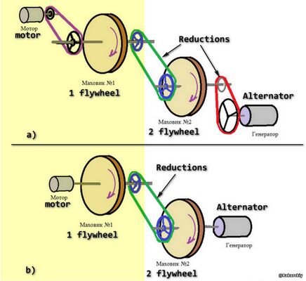 Проблема полягає в тому, що панує думка, що маховик не може одночасно отримувати крутний момент, накопичувати його та передавати навантаженню зі збільшеною потужністю. Якщо взяти акумулятор, підключити лампочку, додати конденсатор паралельно та чекати дива, акумулятор з конденсатором дасть вам більше, ніж має акумулятор. Приблизно так працює маховик. Маховик можна заряджати, розкручуючи його (збільшуючи швидкість обертання) та віддаючи його (зменшуючи швидкість обертання). Однак маховик має одну властивість, якої немає в електричного конденсатора. З кожним обертом після точки "i" накопичений крутний момент маховика не чинить опір обертанню, а, навпаки, сприяє прискоренню. Двигун розгону працює постійно, але навантаження повинно мати періоди між накопиченням та розрядом потужності.